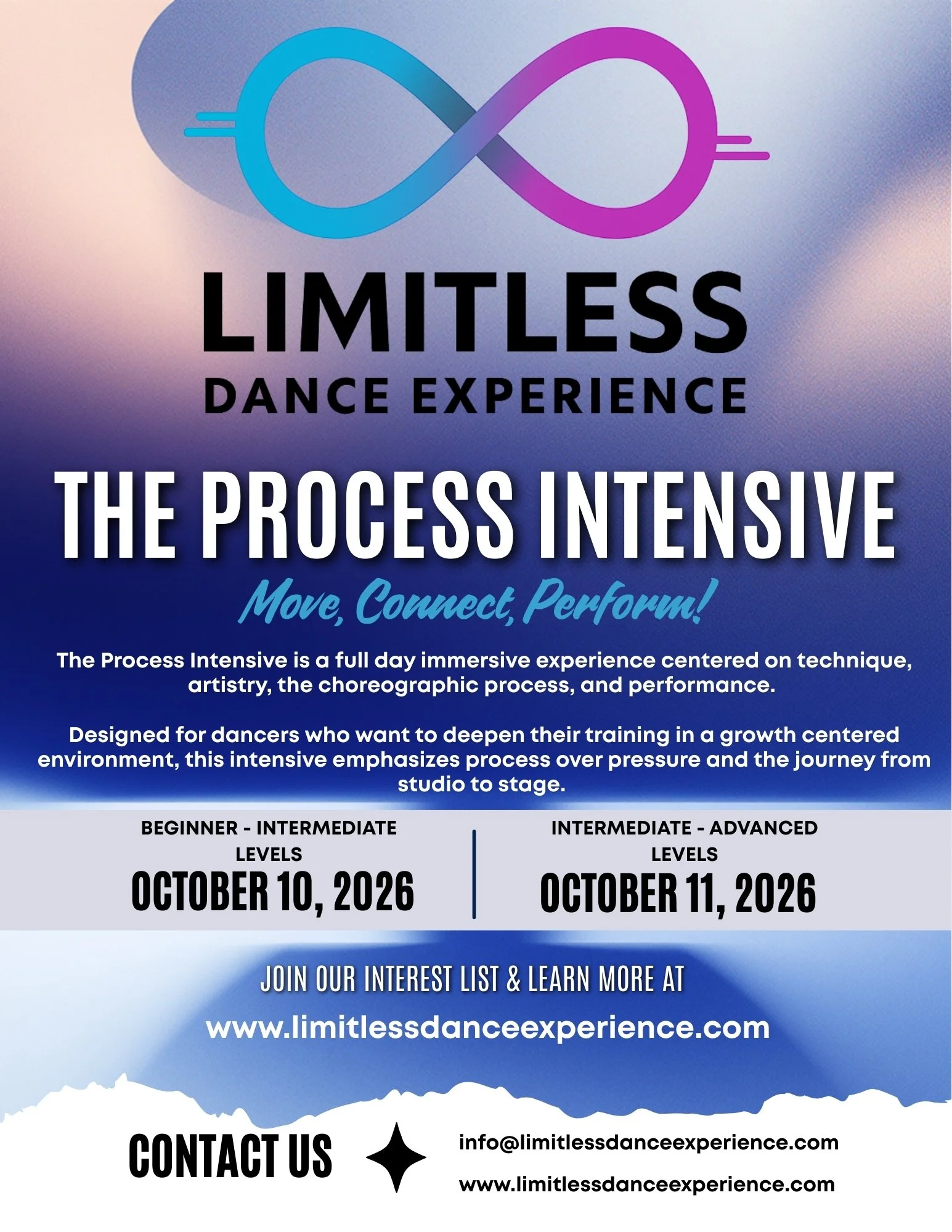 Additional programming will be announced as offerings are confirmed.The Process Intensive is LDE’s pilot educational program. A full-day intensive experience focused on technique, repertory, and performance. Designed for dancers seeking growth in a supportive environment, the intensive emphasizes process, community, and the journey from studio to stage.